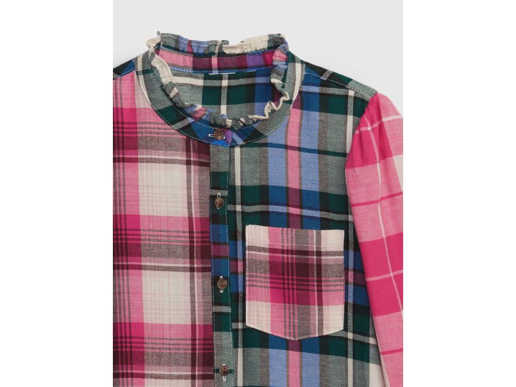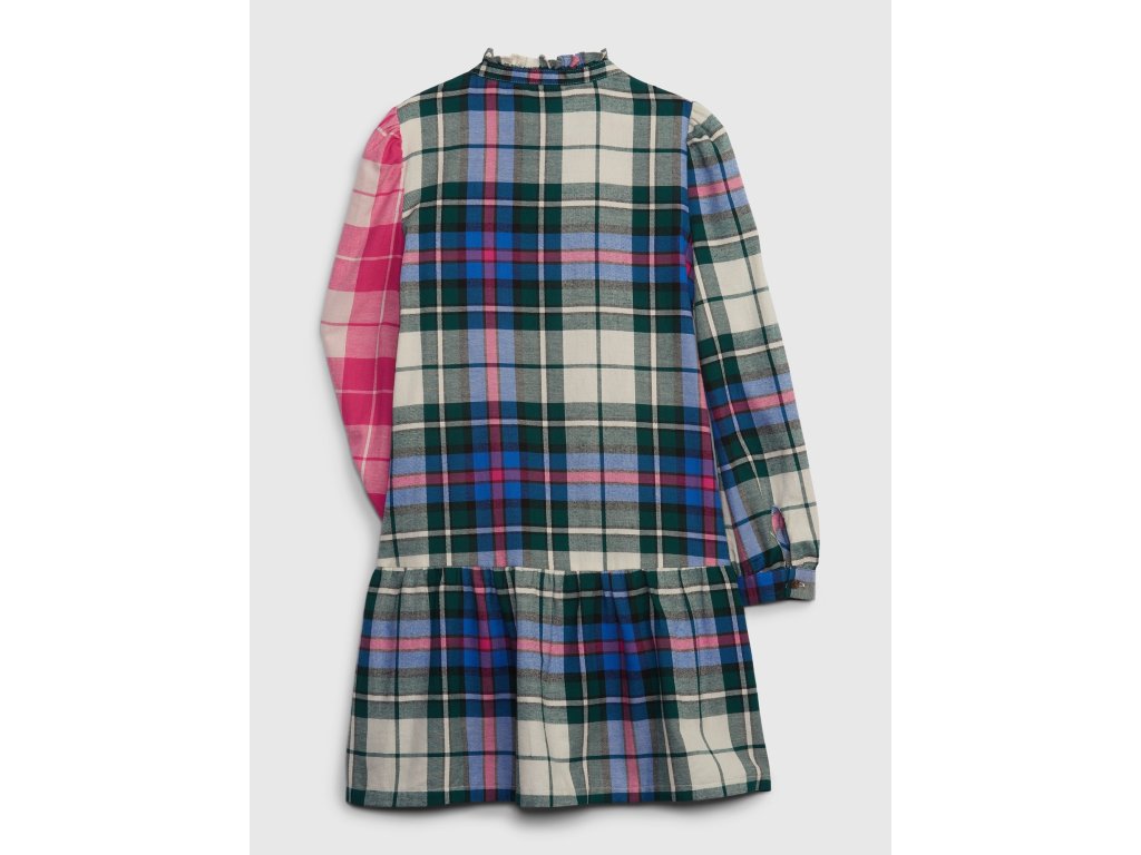 Dievčenské kockované šaty. Rôzne farebná kocka. So zapínaním na gombíky. Okrúhly výstrih ku krku s volánikom. Na hrudi našité malé vrecko. Dlhé rukávy s pružným lemom. Rovný strih a našitý volán. 100% bavlna.Dodatočné parametre