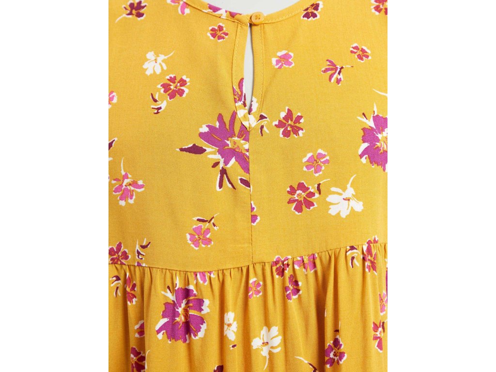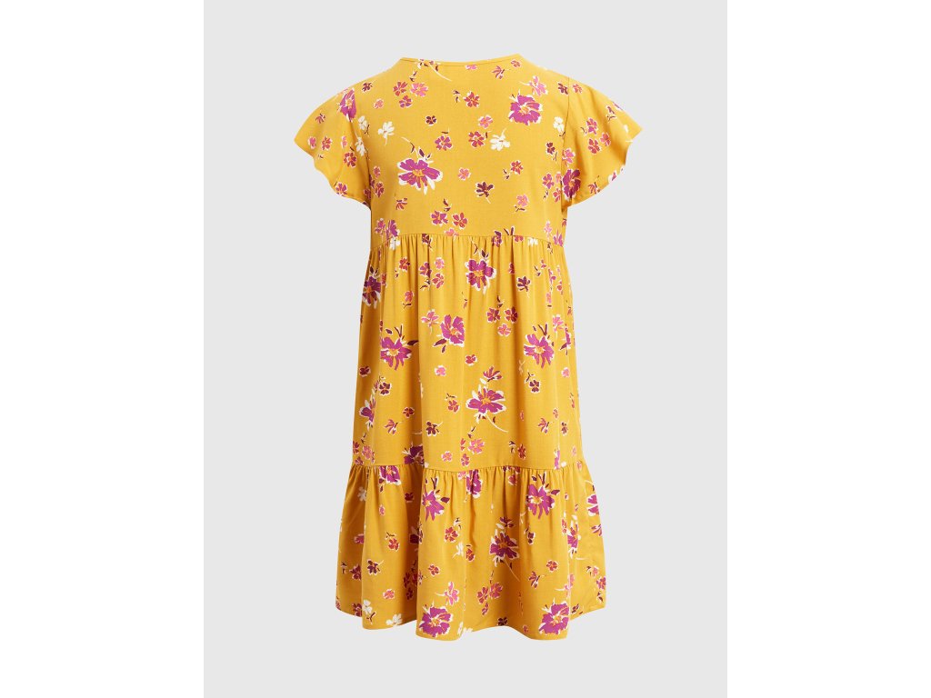 Detské šaty s kvetinovým vzorom. Okrúhly výstrih so zapínaním na jeden gombík. Zošité bohato riasené volány. Krátke rukávy.Dodatočné parametre