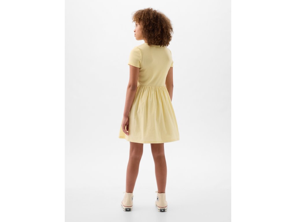 Detské jednofarebné šaty. Krátky rukáv a výstrih ku krku. V páse naberaná sukňa. Dĺžka ku kolenám.Dodatočné parametre