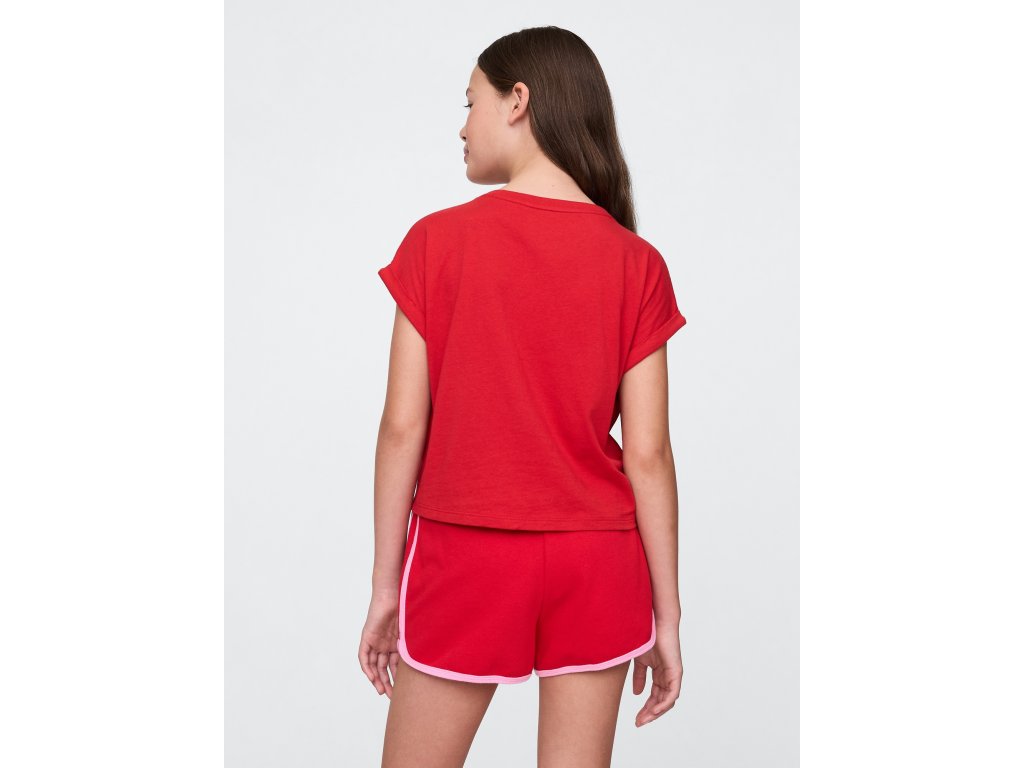Dievčenské tričko s grafikou Gap je ideálnou voľbou pre štýlový každodenný outfit. Vyrobené z mäkkého bavlneného džerseja, ktorý je príjemný na dotyk a vhodný na celodenné nosenie. Okrúhly výstrih a krátke rukávy jemne zakrývajú ramená a dodávajú celkovému vzhľadu dievčenský nádych. Prednú stranu zdobia rôzne varianty grafík a logá Gap – od jemných tónov až po výrazné farebné kombinácie, ktoré dodávajú tričku osobitosť a hravosť. Výrazným prvkom je uzlík na spodnom leme v prednej časti, ktorý vytvára módny detail a jemne tvaruje siluetu pre ležérne upravený vzhľad. Tričko má uvoľnený rovný strih (relaxed fit), ktorý zaisťuje pohodlie a voľnosť pohybu. Dĺžka siaha ku bedrám, čo z neho robí skvelý kúsok ku kraťasom, legínam aj sukni – všestranný doplnok dievčenského šatníka. Pokiaľ preferujete užší strih, odporúčame zvoliť o jednu veľkosť menšiu.Dodatočné parametre