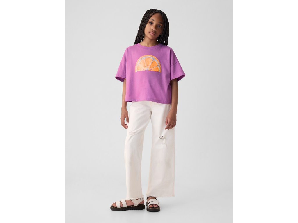 Detské bavlnené tričko s potlačou. Krátke rukávy a okrúhly výstrih. Rovný strih a skrátená dĺžka.Dodatočné parametre