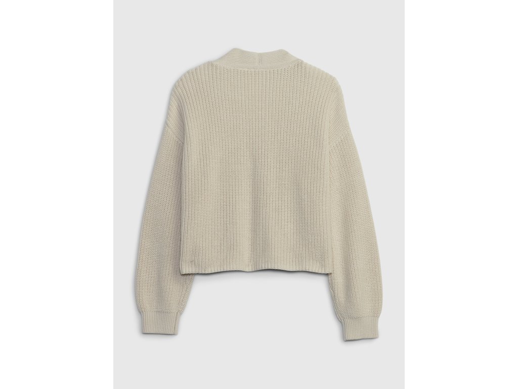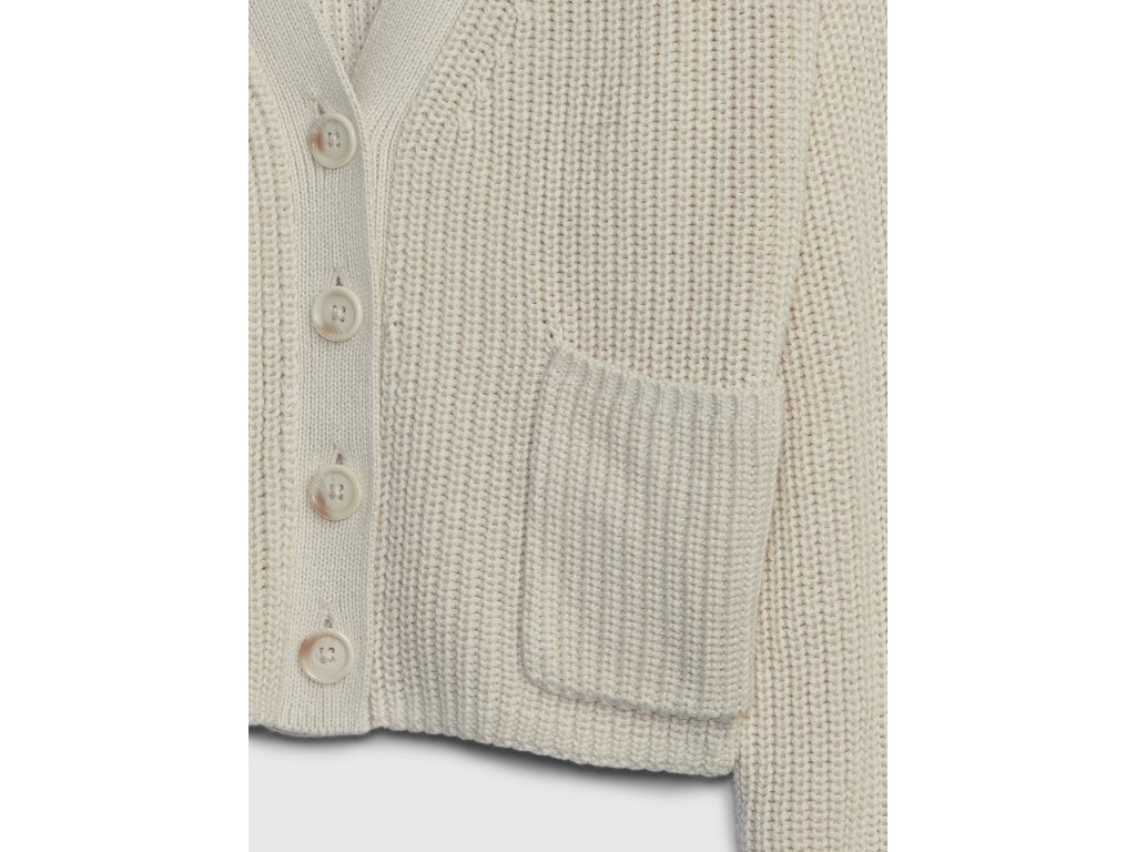Detský sveter na zapínanie. Spadnuté dlhé rukávy. Hlboký výstrih do V. Kratší strih a pružné lemy. Rebrovaný vzor. Predné vrecká.Dodatočné parametre