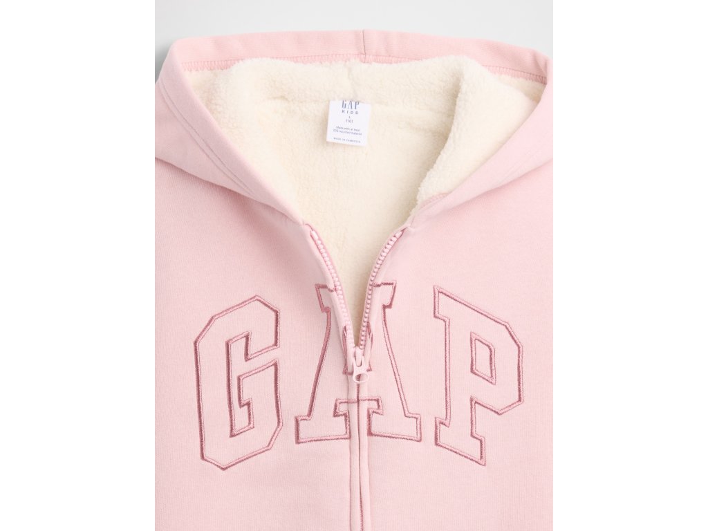 Dievčenská mikina z mäkkého fleecu so zateplenou sherpa podšívkou v kapucni aj tele poskytuje hrejivý komfort v chladnejšom počasí. Má kapucňu, celoprepínací zips, dlhé rukávy s rebrovanými manžetami a praktické vrecká. Prednú časť zdobí ikonické logo Gap, spodný lem je rebrovaný na lepšie držanie tvaru. Materiál obsahuje 21% recyklovaného polyesteru, ktorý pomáha šetriť zdroje a znižovať odpad. Rovný pohodlný strih siaha do pása.Dodatočné parametre