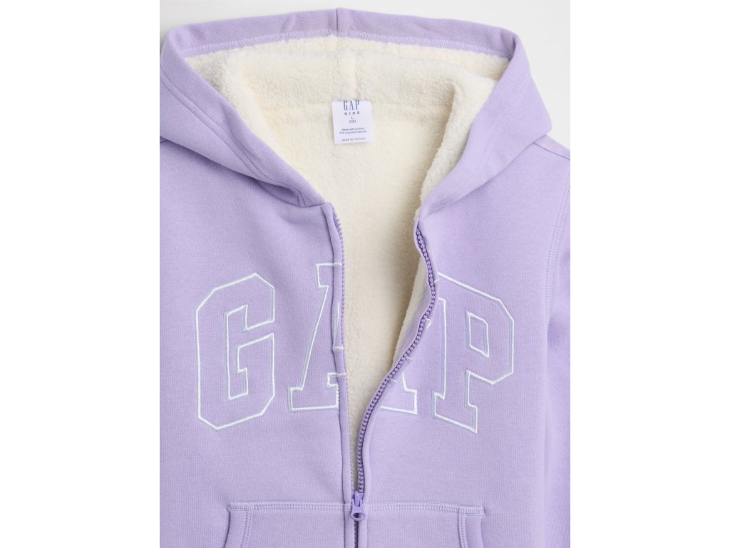 Dievčenská mikina z mäkkého fleecu so zateplenou sherpa podšívkou v kapucni aj tele poskytuje hrejivý komfort v chladnejšom počasí. Má kapucňu, celoprepínací zips, dlhé rukávy s rebrovanými manžetami a praktické vrecká. Prednú časť zdobí ikonické logo Gap, spodný lem je rebrovaný na lepšie držanie tvaru. Materiál obsahuje 21% recyklovaného polyesteru, ktorý pomáha šetriť zdroje a znižovať odpad. Rovný pohodlný strih siaha do pása.Dodatočné parametre