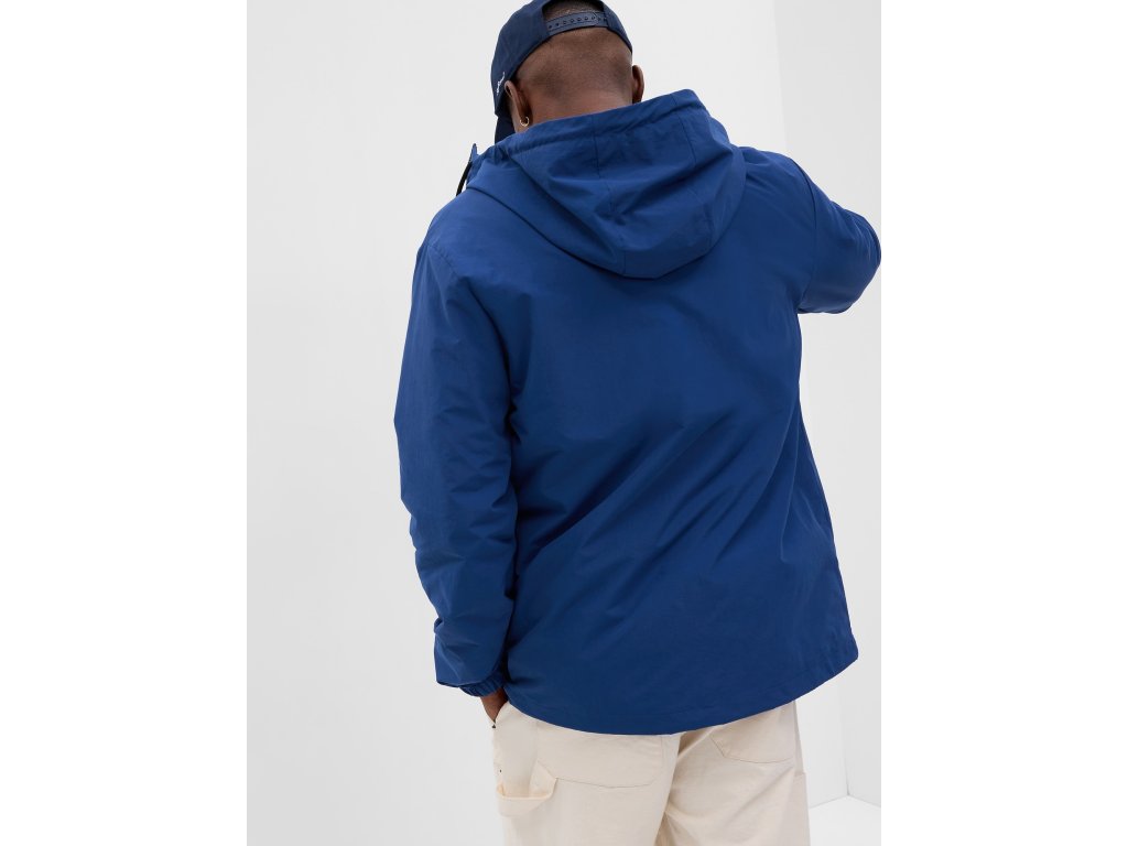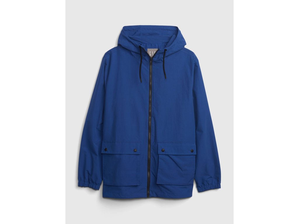 Vodoodpudivá a vetruodolná bunda z bavlneno-nylonovej zmesi. Kapucňa so sťahovacími šnúrkami. Dlhé rukávy s pružnými manžetami. Zapínanie na zips vpredu. Nastaviteľné šnúrky s brzdičkami na bočných švoch. Rovná silueta s ležérnym strihom. Dĺžka siaha po boky. Modelové meria 185–188 cm, majú obvod pása 79 cm a vnútornú dĺžku nohavíc 81–84 cm, na sebe majú veľkosť Gap M.Dodatočné parametre