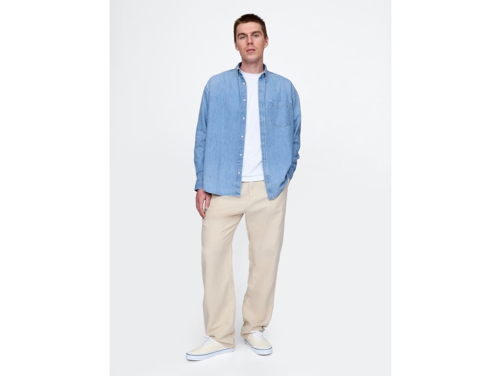 Pánska oversize košeľa z mäkkého bavlneného denimu je nadčasovým kúskom, ktorý kombinuje pohodlie a štýl. Má klasický špicatý golier, zapínanie na gombíky a dlhé rukávy s manžetami na gombíky. Na hrudi je praktické našité vrecko, ktoré dopĺňa jej dizajn. Tento produkt je súčasťou programu Washwell, ktorý znižuje spotrebu vody pri výrobe o 20 % v porovnaní s bežnými metódami, čím prispieva k udržateľnejšiemu prístupu k výrobe. Košeľa bola vyrobená vo výrobnom závode podporujúcom rodovú rovnosť a posilňovanie postavenia žien prostredníctvom programov RISE a P.A.C.E. od Gap Inc. Oversize strih ponúka voľné a pohodlné nosenie, ideálne na vrstvenie alebo ležérne outfity. Táto košeľa siaha k bokom a je univerzálnou voľbou pre každodenný aj formálny štýl. Pokiaľ preferujete užší strih, odporúčame zvoliť o jednu až dve veľkosti menšie. Modelové meria 185–188 cm, majú obvod pása 79 cm a dĺžku vnútorného švu 81–84 cm. Na sebe majú veľkosť Gap M.Dodatočné parametre