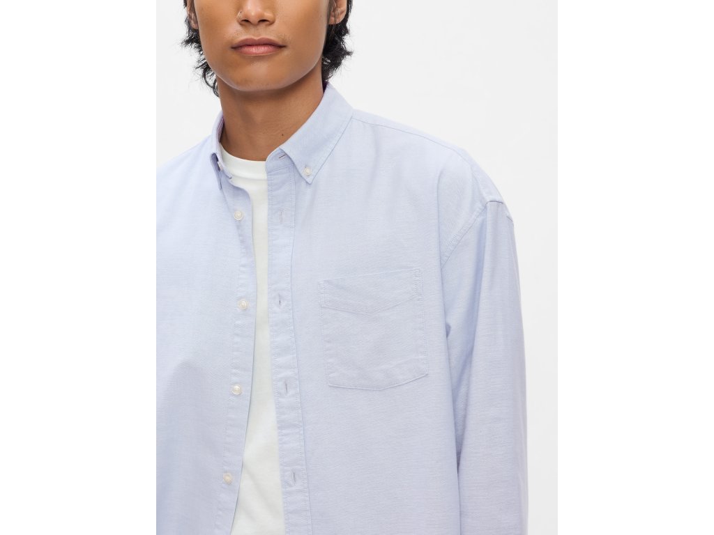 Táto hladká oversized košeľa z bavlneného streča v oxford štýle je dokonalým spojením klasiky a moderného komfortu. Golier s gombíkmi dodáva tradičný vzhľad, zatiaľ čo dlhé rukávy s manžetami na gombíky zaisťujú pohodlné nosenie. Zapínanie na gombíky po celej dĺžke dodáva košeli nadčasovú eleganciu, a náprsné vrecko pridáva praktický detail. Košeľa je vyrobená z 98% bavlny z prechodného organického poľnohospodárstva, ktoré nepoužíva syntetické pesticídy ani hnojivá, čo ju robí šetrnejšie k životnému prostrediu. Oversize strih je voľný a pohodlný. Pre klasický vzhľad odporúčame zvoliť o jednu až dve veľkosti menšie. Modelové majú výšku 185–188 cm, obvod pása 79 cm, dĺžku nohavíc 81–84 cm a nosia veľkosť M.Dodatočné parametre