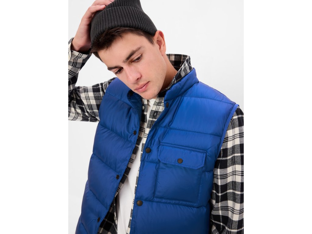 Pánska prešívaná a vodeodolná vesta. So zapínaním na cvoky. Na hrudi našité vrecko s chlopňou. Pri krku kratší stojačik. Rovný strih a bočné vrecká. Z recyklovaného polyesteru.Dodatočné parametre