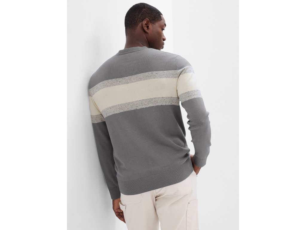 Pánsky pletený sveter. Na hrudi a rukávoch pruhy. Okrúhly výstrih s rebrovaným nápletom. Dlhé rukávy s nápletmi.Dodatočné parametre