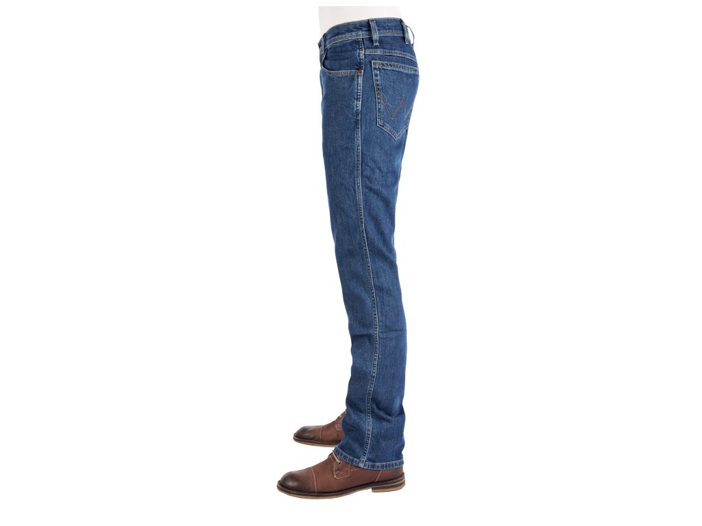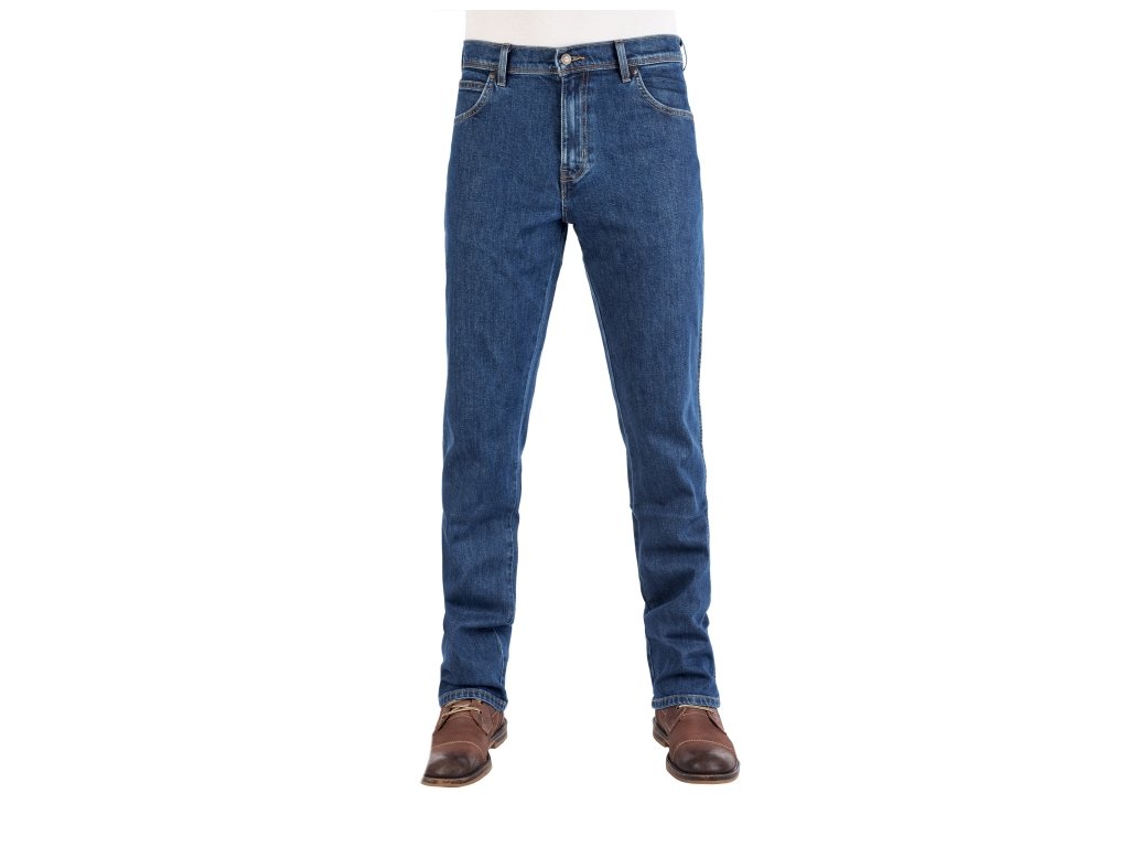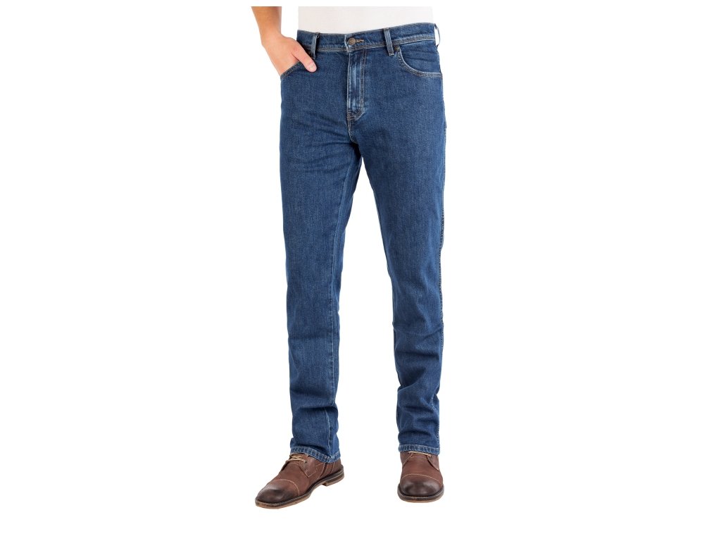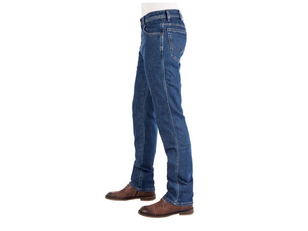 Jednoduchá klasika, rovná voľnejšia nohavica. Päť kapsové nohavice, ktoré sú olemované mosadznými nitmi a gombíkom so zapínaním na zips sú vhodné na každodenné nosenie do práce i pre voľný čas. Sú ušité z pevnej rifľoviny s vysokým obsahom bavlny. Tmavomodrá farba týchto nohavíc sa hodí ako k jednoduchému tričku, tak aj k akémukoľvek typu košele. Na pravej zadnej kapse vyniká kožená nášivka s logom značky WRANGLER. Vďaka pevnému materiálu sú nohavice vhodné do každého počasia.